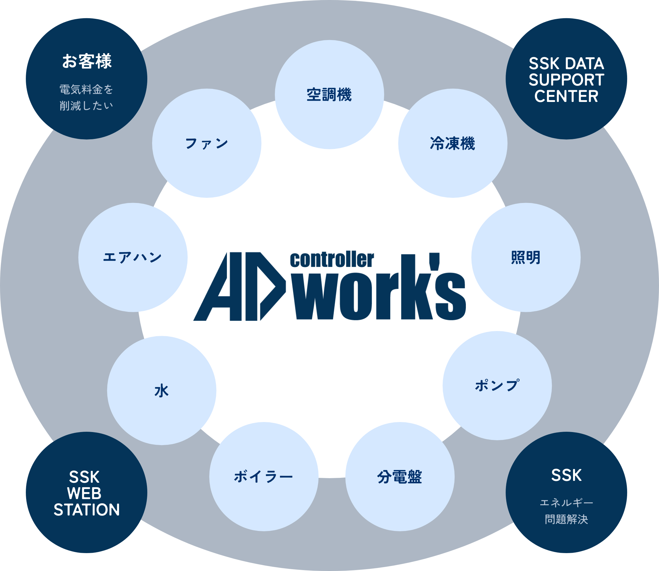 ADwork’sより提供されるエネルギーデータの管理機能やエネルギー使用機器の制御機能を最大限に活用するためのフレームであり、省エネルギーに取り組むすべての人・モノを包括したエネルギー管理基盤システムとなります。